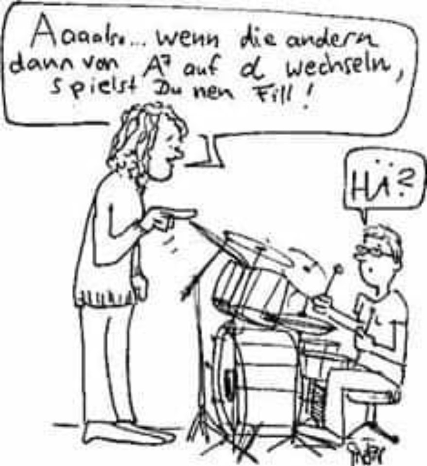Ich hab mal mit nem Drummer gespielt, der meist vor unserer Probe noch Unterricht gab. Ich bin dann oft absichtlich etwas früher da gewesen und hab mir nen Spaß draus gemacht, seine Schüler mit Triolen und Synkopen zu verwirren.