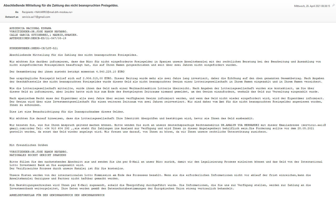 Lustig, eine spanische Anwaltskanzlei mit russischer E-Mail-Adresse.