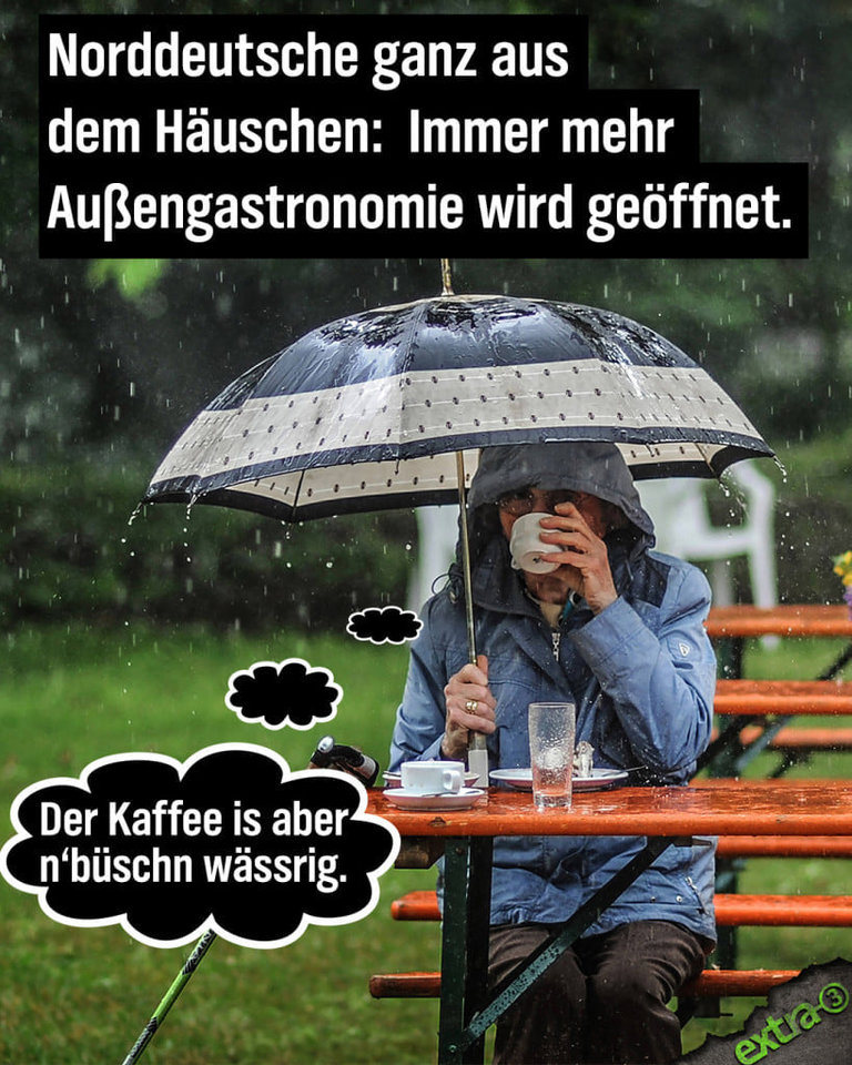 In Norddeutschland ist das nur erhöhte Luftfeuchtigkeit, Regen ist es erst, wenn er waagerecht kommtHarmlos! Der Regen fällt ja vertikal, nicht horizontal!