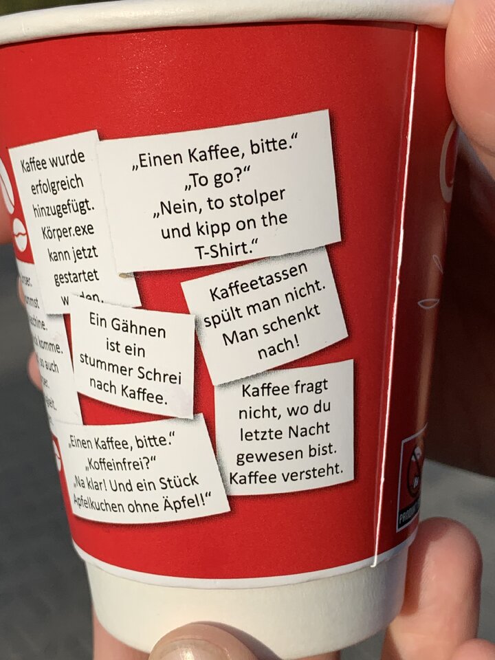 Der eigentliche Witz war der Kaffee in diesem Becher - ein kleiner Schluck, dann weggeschüttet.