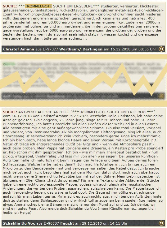 Ein junger, begabter Bauchredner tritt in Abendlokalen auf. Eines Nachts zeigt er seine Kunst im Gasthaussaal eines kleinen Ortes irgendwo am Lande. Mit seiner Rednerpuppe am Knie bringt er sein gewohntes Repertoire an Blondinenwitzen. Einer jungen, hübschen Blondine, in der vierten Reihe sitzend, wird das nach einer kurzen Weile zu bunt. Sie steht auf und protestiert lautstark: „Ich hörte nun genug von Ihren blödsinnigen Blondinenwitzen. Wie können Sie es wagen, alle Blondinen in diese stereotype Dümmlichmaske hineinzwängen zu wollen?! Was hat die Farbe des Haares mit dem Wert einer Person als menschliches Wesen zu tun? Es sind Kerle wie Sie, die es verhindern, dass Frauen wie ich im Arbeitsumfeld und Gemeinwesen respektiert werden und somit nicht das volle Potenzial der möglichen persönlichen Entwicklung erlangen. Sie und Ihresgleichen verewigen die Diskriminierung nicht nur der Blonden, sondern aller Frauen generell … und das noch dazu im Namen des Humors!“ Dem Bauchredner ist die Szene ungemein peinlich; er beginnt sich zu entschuldigen, aber die Blondine schreit zurück: „Sie halten sich da raus, mein Herr! Ich spreche zu dem Blödmann, der auf Ihrem Knie sitzt!“