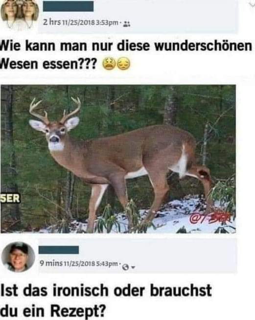 Der Hirsch springt hoch,Das Reh lebt einzeln und in Rudeln, am besten schmeckt´s mit breiten Nudeln.![]()