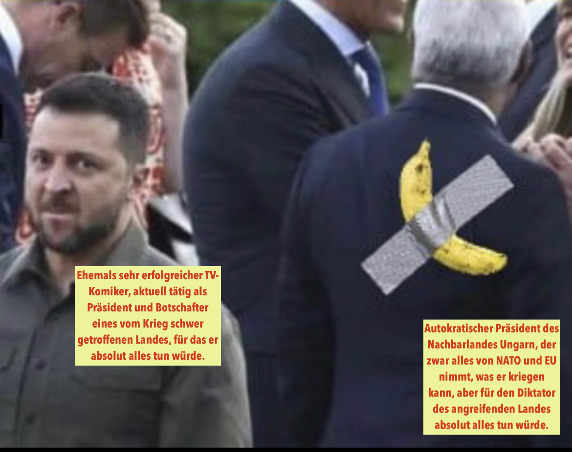 Aber im Bild steht Selensky westlich von Orban, der wiederum nach Nordosten guckt. Eigentlich liegt die Ukraine östlich von Ungarn. Vielleicht ist das ja der Witz, das Selensky falsch steht.Die Banane ist eine tropische Frucht, auch SĂŒdfrucht genannt. SĂŒden ist eine Himmelsrichtung, so wie Osten. Die Ukraine liegt im Osten...