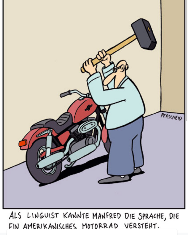 Nach meinem Wissensstand (ich kenne etliche Harley-Fahrer) hast Du das recht gut skizziert.Er illustriert die Grobschlächtigkeit amerikanischer Motorräder, die nur grobe Stiefelsprache verstehen, oder halt hammerharte Behandlung. Müsste man aber Harley-Fahrer fragen, ob das stimmt (die Antwort kann man sich ausmalen). Ich kenne diese Eisen nicht und möchte sie auch nicht kennen lernen.