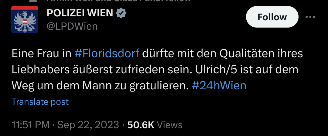 Also die Polizei wurde wegen Ruhestörung gerufen (laute "Liebesgeräusche"), "Ulrich/5" ist der Name der Streife die dort gerade auf den Weg ist um wohl zu bitten etwas leiser zu sein (oder eben dem Mann nur zu gratulieren)![]()