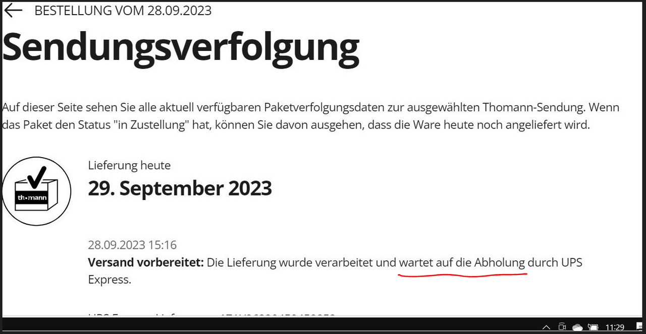 "Das Zustelldatum wird aktualisiert, sobald UPS in den Besitz des Pakets gelangt."![]()