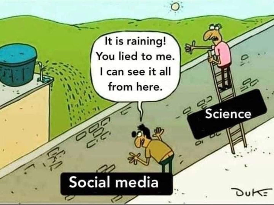 Das ist übrigens ein fehlerhafter Versuch, soziale Medien und Wissenschaft zu vergleichen (was an sich schon Blödsinn ist). Denn beide haben in ihrem Ausschnitt der Realität Recht.