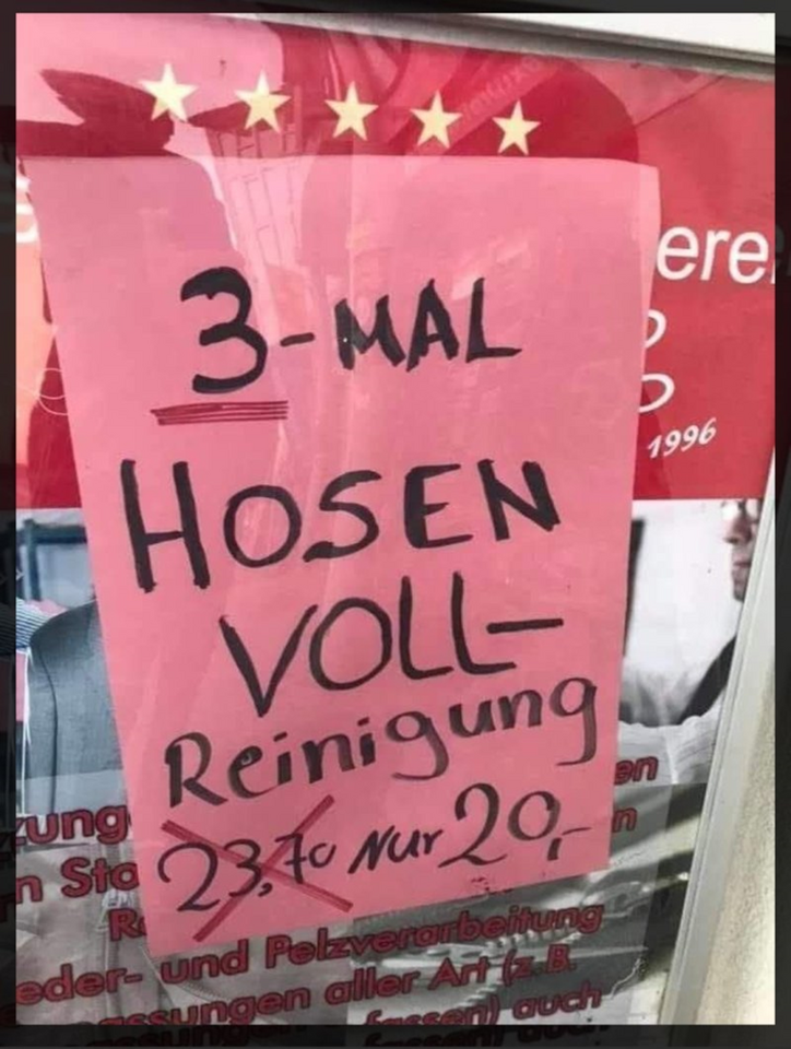 Das erinnert mich an eine (nicht mehr existente) Metzgerei in Taufkirchen/Vils. Da waren die Angebote wie z.B. "Nackensteak vom Schwein 100g 0,99 DM" oder "Filet vom Rind 500g ..." von innen mit Tesa an das Schaufenster geklebt. Man hat sich da nicht sehr viel darum geschert, ob die Blätter überlappen. Irgendwann war wieder ein Ausbildungsplatz frei - also ein Blatt in's Schaufenster worauf stand: "Wir stellen ein: 1 Lehrling". Das Stellenangebot hing da und irgendwann wurde wieder überklebt - mit dem Ergebnis: "Wir stellen ein: 1 Lehrling vom Schwein ..."