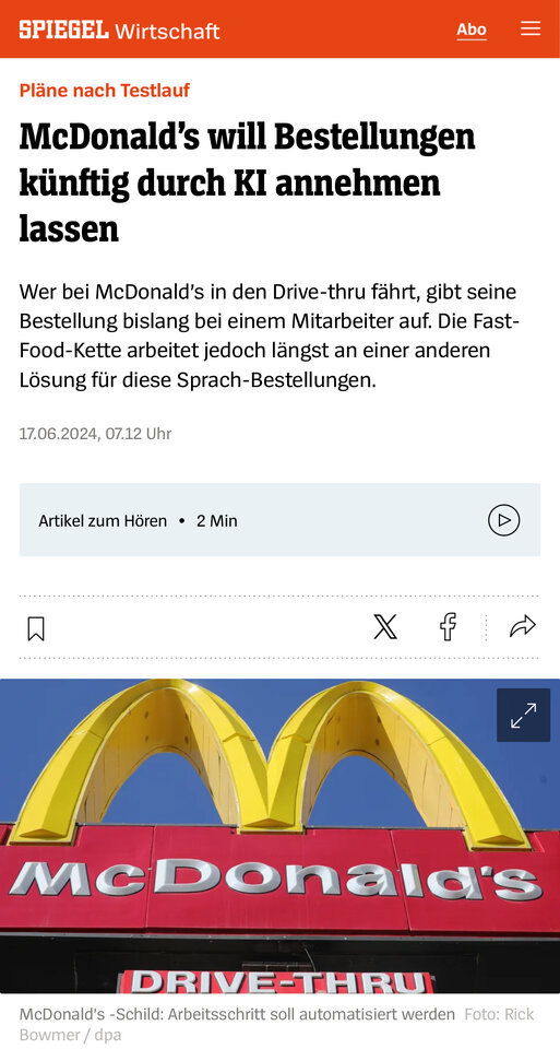 Aber wir alle wissen, dass das ein alter Hut ist, denn die Chinesen sind da längst viel weiter und verwenden die KI seit vielen Jahren erfolgreich bei der Bestellannahme: