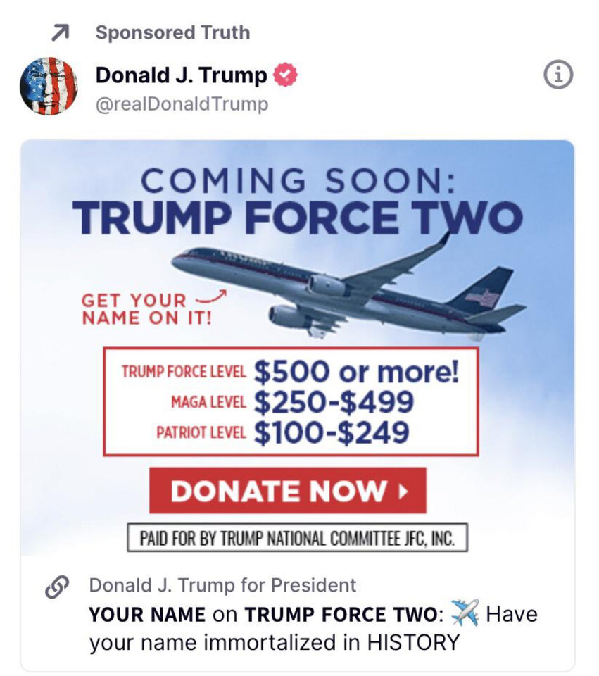 Ja, und es ist mir 500 USD wert, meinen Namen auf Trumps Flieger zu sehen.