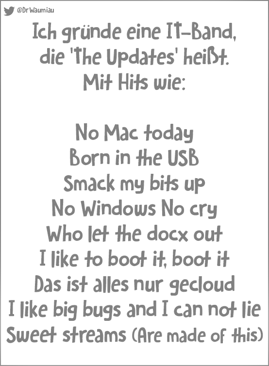 Jahaaa… ich weiß schon, wie‘s gemeint ist. Mich nervt aber einfach das (weit verbreitete) Missverständnis was die Textzeile bedeutet. Ganz sicher nicht „Kein Weib, kein Geheule“![]()