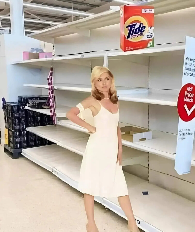 Miese Fotocollage mit Waschmittel, leeren Regalen, Blondie?