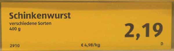 1,99 für die Wurst plus 0,20 für den Metzgersdaumen. Passt!