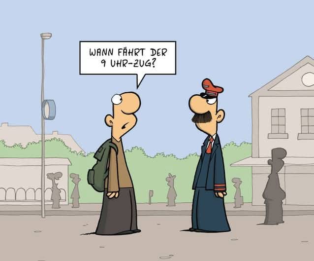 Nach der Länge der Schatten dürfte es so ca. 11.30 sein, also wäre die Frage berechtigt und bei der Bahn keine Seltenheit und kein Witz. Wäre jedoch die Antwort des Schaffners, der Zug ist exakt um 9.00 Uhr losgefahren, dann wäre es witzig.ich verstehe den witz nicht!!!