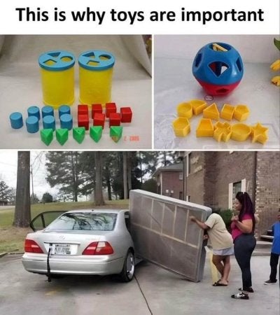 Ja, das kenne ich auch. Und die Streberin, die das beobachtet bekommt fast eine Kernschmelze.Und dann war da noch der Typ, der hat ausnahmslos alle Teile des Spielzeugs durch das größte von all den Löchern durchgefummelt. Ich kann bloß das Video nicht mehr finden. (Dieses Sielzeug nennt sich übrigens "Formsortierer". Habe ich bis gerade eben auch nie gehört.)