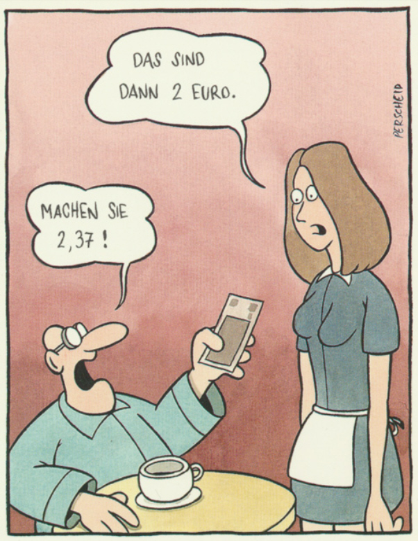 Wenn ich in der Kneipe bin, und der Wirt meint dann: "Macht 27€.", Leg ihm immer nen Fünfer hin und sage: "Mach 12..."