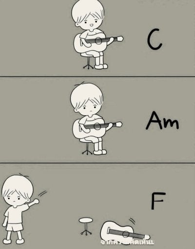 Klassischer Ablauf bei Anfängern auf der akustischen Gitarre: C und Am sind als offene Akkorde leicht zu greifen und auch der Wechsel zwischen den zwei Akkorden ist einfach. Wenn man dann als Anfänger das erste Mal mit F als vollem Barré-Griff konfrontiert wird zeigt sich, wie frusttolerant man ist. Sowohl der Akkord an sich als auch das Umgreifen in den Akkord sind für Anfänger oft echte Herausforderungen.