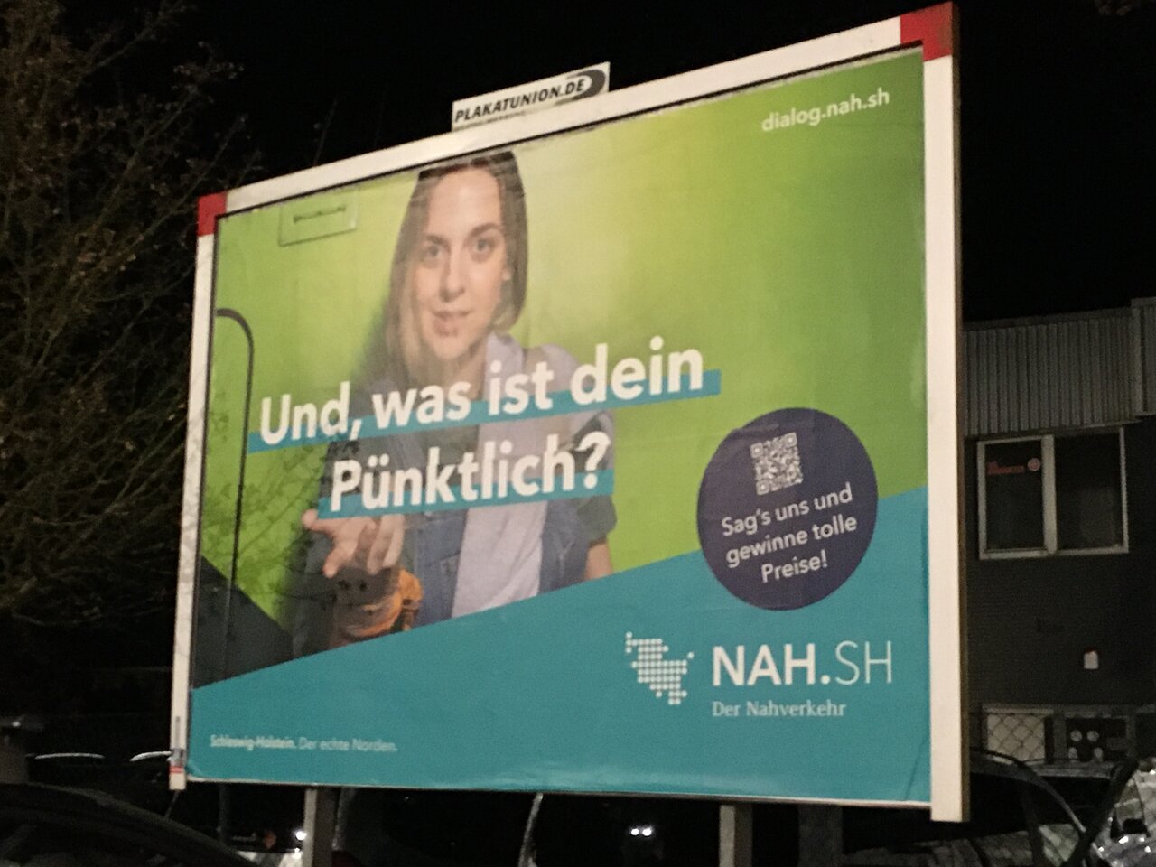 hm, mein Zug heute früh hatte 2 Minuten Abfahrtsverspätung, da hat sich der Lokführer entschuldigt. Er hat die Verspätung aber wieder eingeholt. Da lobe ich mir die SBB.NAH.sh ist der Nahverkehrsverbund Schleswig-Holstein GmbH, zuständig für die Koordination und die nachhaltige Weiterentwicklung der öffentlichen Mobilität, sowie für die Planung, die Organisation und die Abwicklung des öffentlichen Personennahverkehrs in Schleswig-Holstein. Die Werbung in eigener Sache funktioniert schon mal, der ÖPNV eher so lala. Ganz mein Humor: