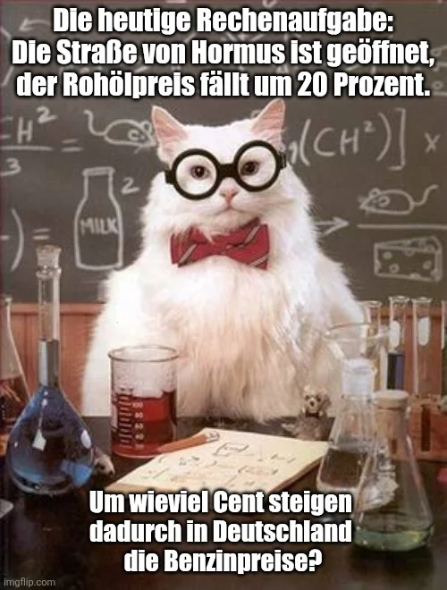 Da ist die Frage schon unzulässig. Die Regierung hat festgelegt, dass die Tankstellen nur noch einmal am Tag mittags um Zwölf die Preise erhöhen dürfen. Und genau das tun sie seitdem. Einmal am Tag die Preise erhöhen. Was hat der Ölpreis damit zu tun?