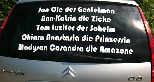 Ich meine, die strengen Regelungen gelten nur für den Erstnamen...Zuerst musste ich da auch lachen. Dann dachte ich, welche arme Socke sich diese ganzen Doppelnamen ausgedacht haben mag. Und dann ist es wohl doch Fake, da Luzifer als Name von den Standesämtern nicht anerkannt wird. Oder die letzten drei Zweitnamen sind hinzugedichtet, zumal die verdächtig gut am Charakter orientiert sind. Dennoch, gut ist das.