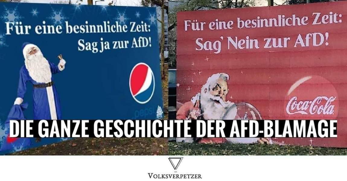 Schritt 1: Jemand stellt ein Fake-Weihnachts-Plakat von Coca Cola auf, auf dem "Für eine besinnliche Zeit: Sag' Nein zur AfD!" steht.....