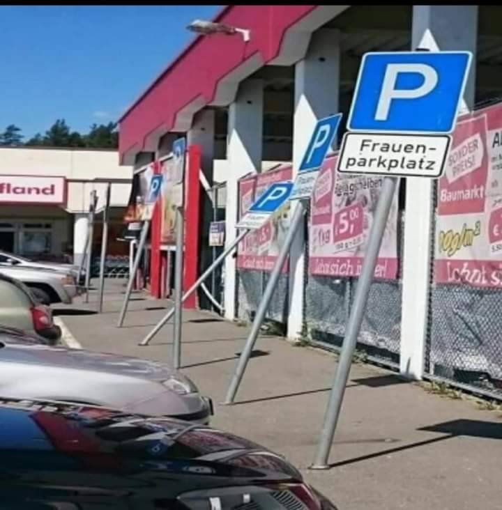 Was für eine Scheissgegend, in der du lebst! Man könnte meinen, da sind nur Arschlöcher unterwegs90% der menschen, die ich bei uns um die ecke beim supermarkt auf den frauen-, mutter-kind- und behindertenparkplatzen parken sehe sind alleinstehende männer... wenn die so gut einparken wie sie schilder lesen ist mir das bild klar.
