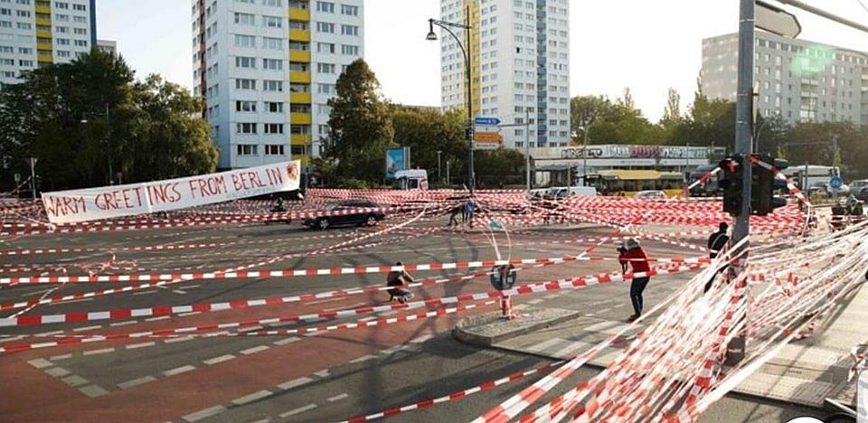 Und nach der Aktion wanderten die gestreiften Bänder auf den Müll.......In Berlin wurden gestern die Strassen für die Klimademonstration vorbereitet...