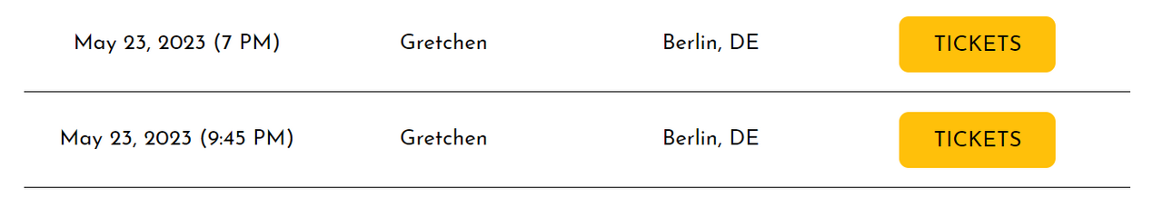 Yep lustig, das hab ich auch letztens gesehen, aber ob das so cool is 2 shows an einem Abend? Tickets gibts unter https://www.tixforgigs.com/Event/48344 würd mich allerdings beeilen, is bestimmt morgen schon wieder ausverkauftUpdate: es gibt wohl ein late show Konzert am gleichen Tag im Gretchen