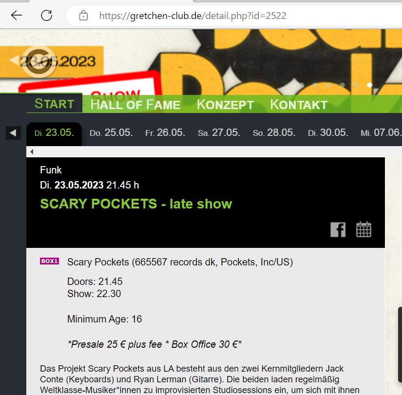 Update: es gibt wohl ein late show Konzert am gleichen Tag im Gretchen@bassmansemi: In Hamburg und Köln wurde mehrfach der Veranstaltungsort gewechselt, immer eine größere Halle, dann gab es auch wieder Karten. Z. B.: ist es in Köln jetzt die Live Music Hall.....(nicht gerade klein)