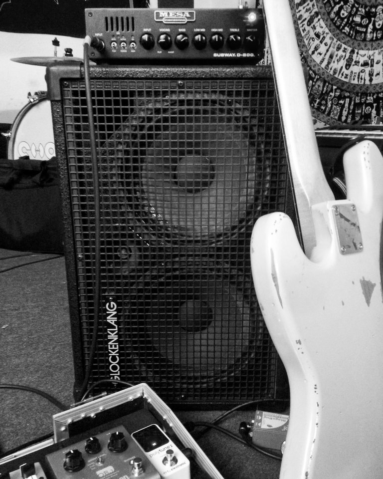 Durch das In-Ear bin ich immer mit einem klaren Bass-Sound verwöhnt gewesen, sodass der Ampsound für mich obsolet wurde. Ich versuche also aus Amp und Box einen möglichst neutralen Sound zu hören, der dem Signal auf den Ohren entspricht. Lange Jahre war ich da bei TecAmp (auch wegen der separaten Endstufe für das Pleasure Board) mit 2x10er Box. Nun bin ich durch einen Hersteller-Support bei einem Mesa D800 gelandet, der erstaunlich neutral klingt und im Vergleich zu Glockenklang kein Nachsehen hatte. Die zugehörige 1x12er Box war allerdings eine färbende Katastophe und wurde schnell gegen eine Glockenklang Duo getauscht. Das klingt genial neutral und ich habe meinen Basssound auf der Bühne wie auf dem Ohr.