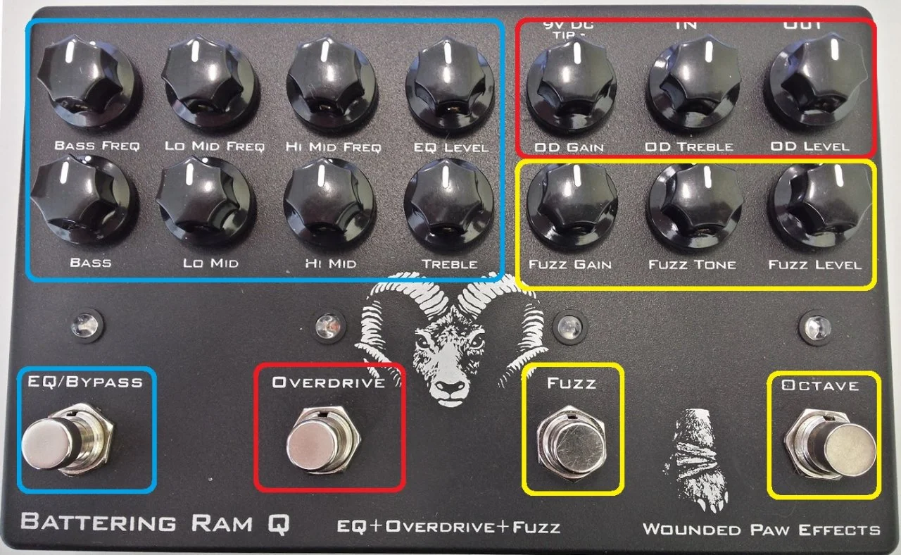 Das Pedal ist somit ein Overdrive + Fuzz Pedal, welches zusätzlich noch über einen 4-Band parametrischen Equalizer verfügt und gebaut ist wie ein Panzer, sehr stabil und wertig. Das fand ich sehr spannend und habe Blind (zum grossen B-Ram gibt es online keinerlei Reviews) bei Wounded Paw bestellt...
