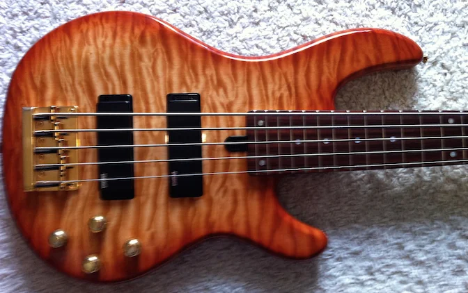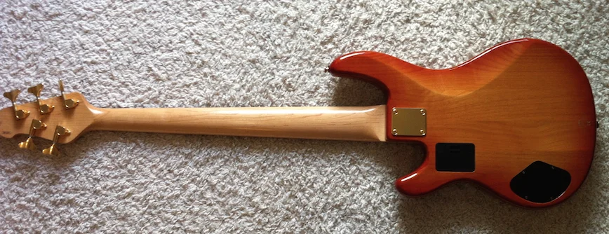 Der Bass stammt schätzungsweise aus den früheren 2000er Jahren. Der Body ist aus Erle mit einem High Definition Top. Der Hals ist ebenfalls Ahorn mit einem Palisandergriffbrett und Matching Headstock. Der Bass liegt wirklich gut in der Hand und ist sehr angenehm zu bespielen. Stringspacing ist 19mm, Gewicht geschätzt mit ca. 4 kg (sehr leichter 5 Saiter).