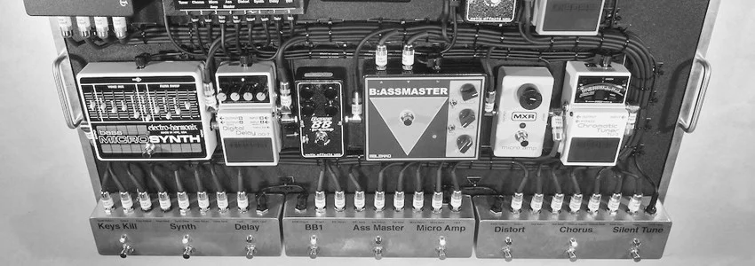 Bass -> Xotic X-Blender (Bypass Switcher mit seriell/parallel Option und dry/wet Regler) -> Mutron III (Envelope Filter) -> zurück zum X-Blender -> Okko Basstard (Zerrer) -> Aguilar Octamizer (Oktaver) -> Little Lehle (Bypass Switcher) -> TC Electronics Nova Modulator -> TC Nova Delay -> zurück zum Little Lehle -> Amp