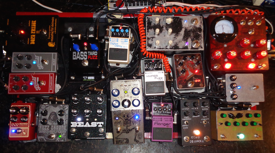 Signal A geht durch das oszillierende Pedal in der Mitte mit dem Skelett (PLL Fuzz + Noise Ensemble), durch den Blaubart Fuzz (grau, rechts) und den schicken Bass Bloom (die Rothaarige) und dann Richtung Amp 2.