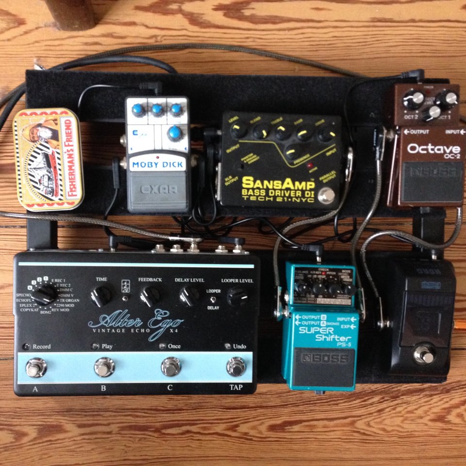 Zum Alter Ego bin ich erst vor kurzem gekommen und wollte ihn ursprünglich eher für Gitarre verwenden. Habe dann aber gemerkt, dass mir das Echoplex-Preset mega gut am Bass gefällt, weil die Repeats nicht wie beim Analog-Delay mumpfig werden und auch nicht exakte Kopien des Urpsrungstons sind (wie beim digitalen Delay), sondern eher an Bässen verlieren. Ich benutze das es für rhythmusorientiertes Delay, häufig punktierte Achtel, gern mit Plek oder geslapt, sodass sich das Echoplex-Preset + Tap Tempo gut macht, da die Repeats nicht matschig werden, der Attack erhalten bleibt und ich das Tempo im Song gerne mal nachjustieren kann.