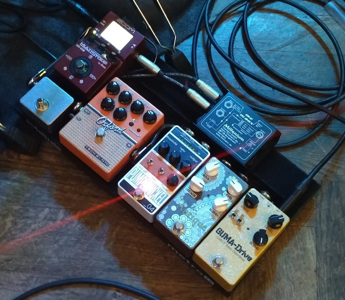 Mein aktuelles Board. Zugegeben Effekt ist nur 1 Chorus drauf; der Rest betreibt Klangformung/-veredlung. Das ganze über eine 600 Watt Tech Uraltendstufe (für 50,00! Euro aktuell geschossen) und eine FMC 118 Pro2. Klingt fett + mächtig.