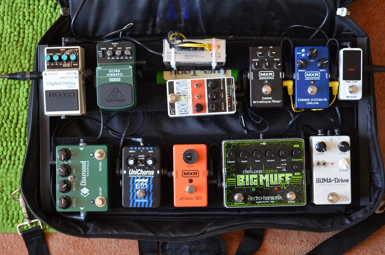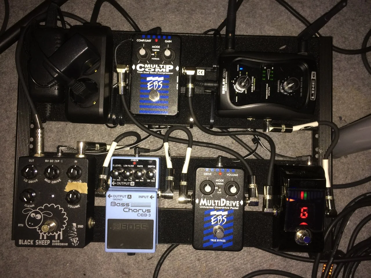 Hallo liebe Bass-Freunde! Ich möchte euch mein Pedalboard vorstellen! Die Signalkette: Bass -> Mooer Baby Tuner -> MXR Bass Octave Deluxe -> MXR Bass Envelope Filter -> Schalltechnik_04 Pumpernickel -> Schalltechnik_04 GUMA-Drive -> EHX Deluxe Bass Big Muff Pi -> MXR Phase 90 -> EBS UniChorus -> Behringer Ultra Vibrato UV300 -> Diamond Tremolo -> Boss Digital Delay DD-3 -> VerstärkerAnhang anzeigen 145854