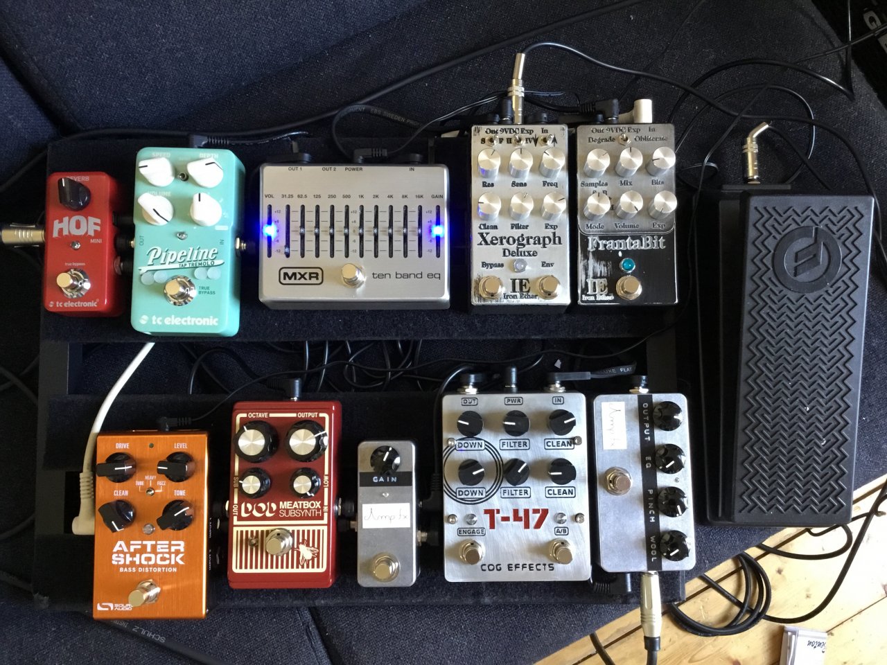Dieses Board ist seit einigen Jahren unverändert. Über den roten Mosquite Blender Expressio kann ich die Zweitboards einschleifen. Die dritte Buchse ist ein EXP-Anschluss über die ich die Effekte vom zweiten Board Dry/Wet steuern kann. Die Cinch-Buchsen darunter nutze ich, wenn ich mal nicht das PT2 mitnehmen will aber trotzdem einige Effekte haben will. Das ist dann ein kleines Board für 3 Effekte.
