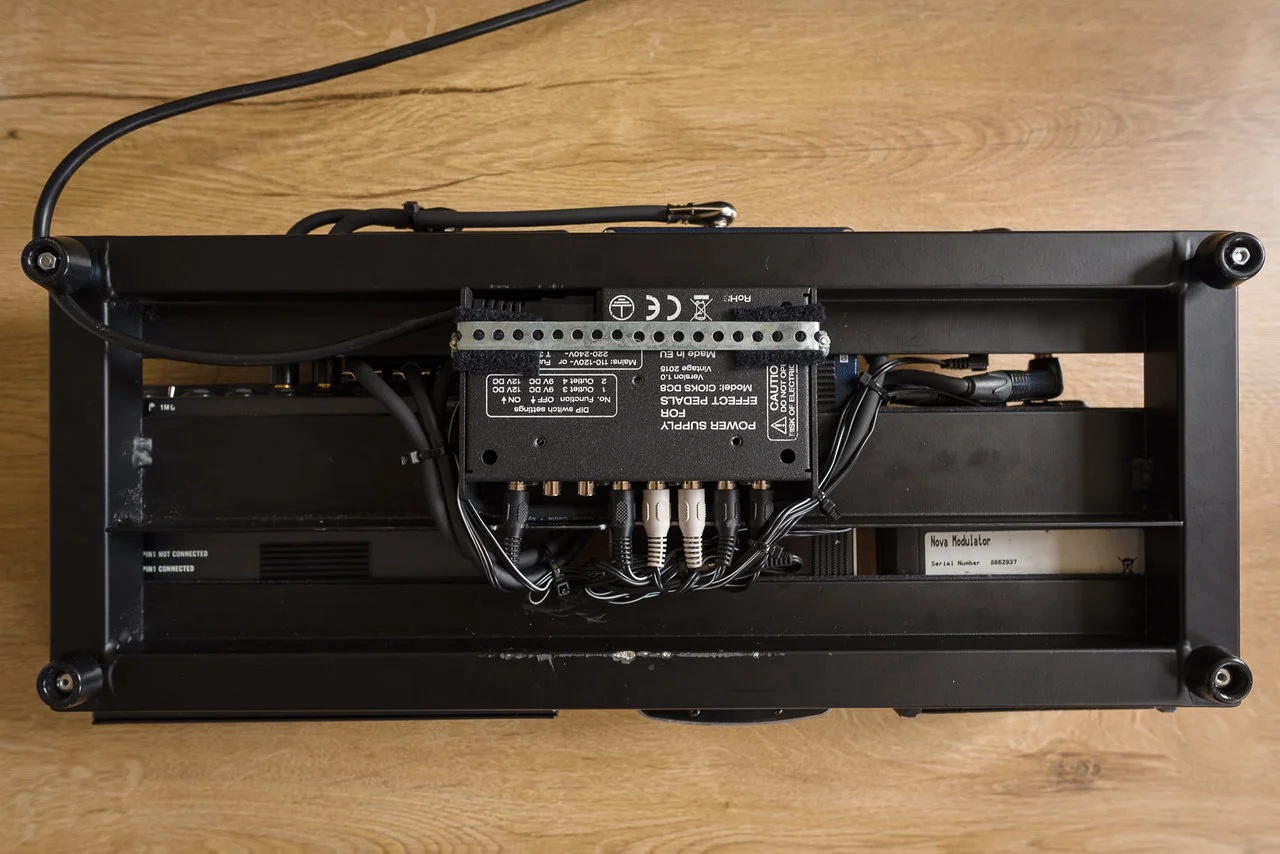 Nachdem ich in der Band nun auch ein bisschen Key-Bass spiele und der Platz am Boden etwas eng wird habe ich mich entschieden etwas Platzsparender in meinem Aufbau zu werden. Insofern bin ich weg vom Koffer hin zu einem Pedaltrain Metro 20 gegangen. Mit leichten Tricksereien und etwas Überhang lässt sich alles montieren. Außerdem habe ich die hinteren Füße etwas mit Beilagscheiben erhöht, damit ich mein Cioks DC8 drunter montieren kann. Ich hab auch ein bisschen an der Mittelstrebe gebohrt um die Stromauslässe zugängig zu machen (das ist der Grund für die Werkzeugspuren an der Unterseite der Streben)