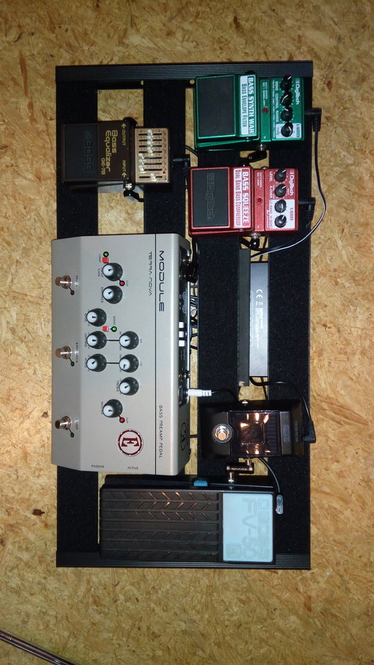 Die zentrale ist der terra nova, dem das volumenpedal vorgeschalten ist, an dessen Tuner out der pitchblack hängt.