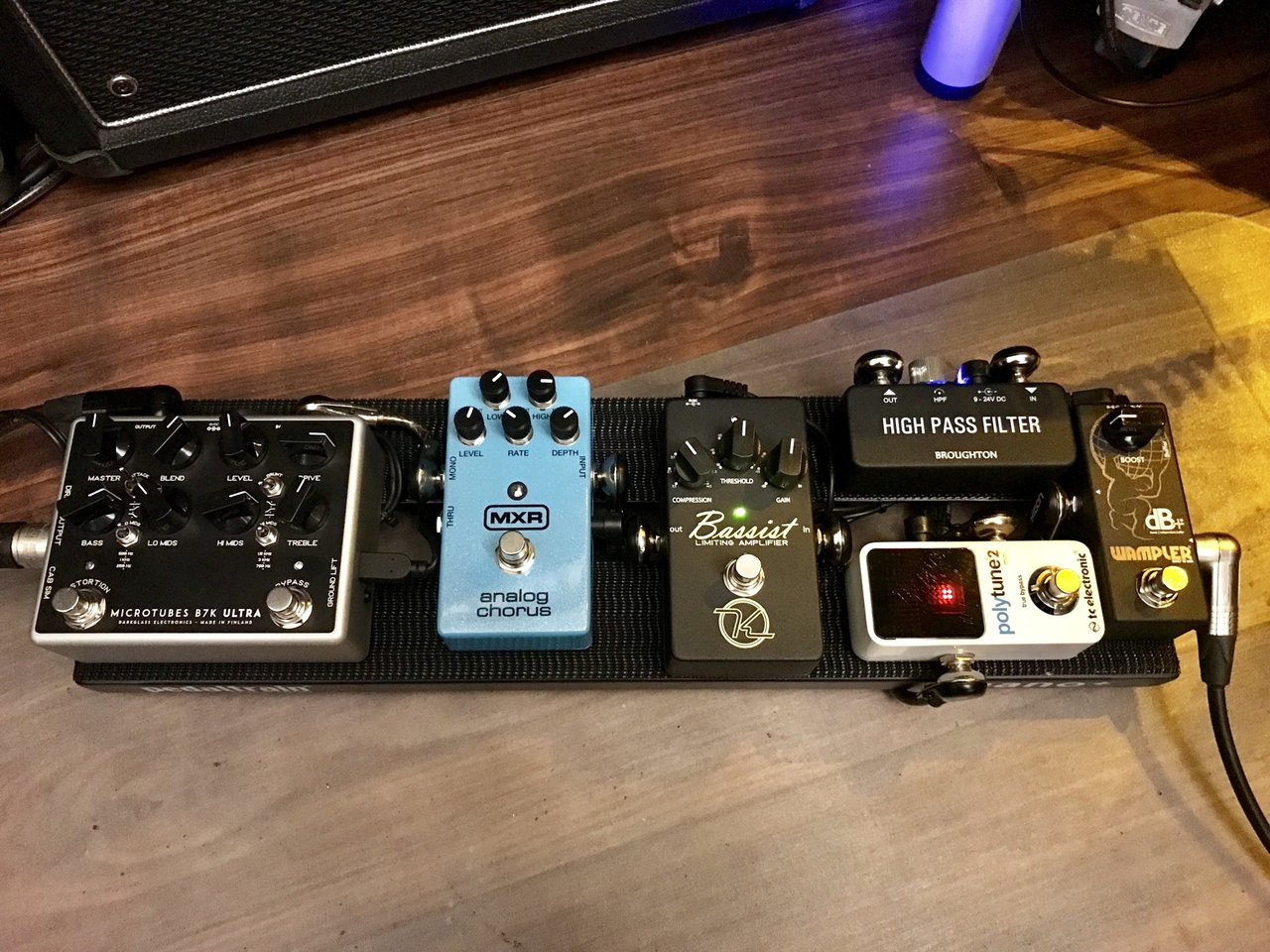 Ich habe etliche Bodentreter entfernt und mache jetzt alles mit dem Fender Gitarrenamp: Chorus oder Hall sowie die beiden Kanäle des Fender Super Champ (siehe zweites Foto mit dem Fender Jazz Bass "Jaco Pastorius Tribute") sorgen für crunchige/cleane bzw. Overdrive/lead-Sounds. Über den Boss Equalizer senke ich vorab die Tiefbässe, um die Box zu schonen (der einzige Schwachpunkt, aber sie macht sich gut) und hebe das Gain an, um die Röhrenendstufe vom Fender anzuheizen, was im Kontext richtig geil klingt.