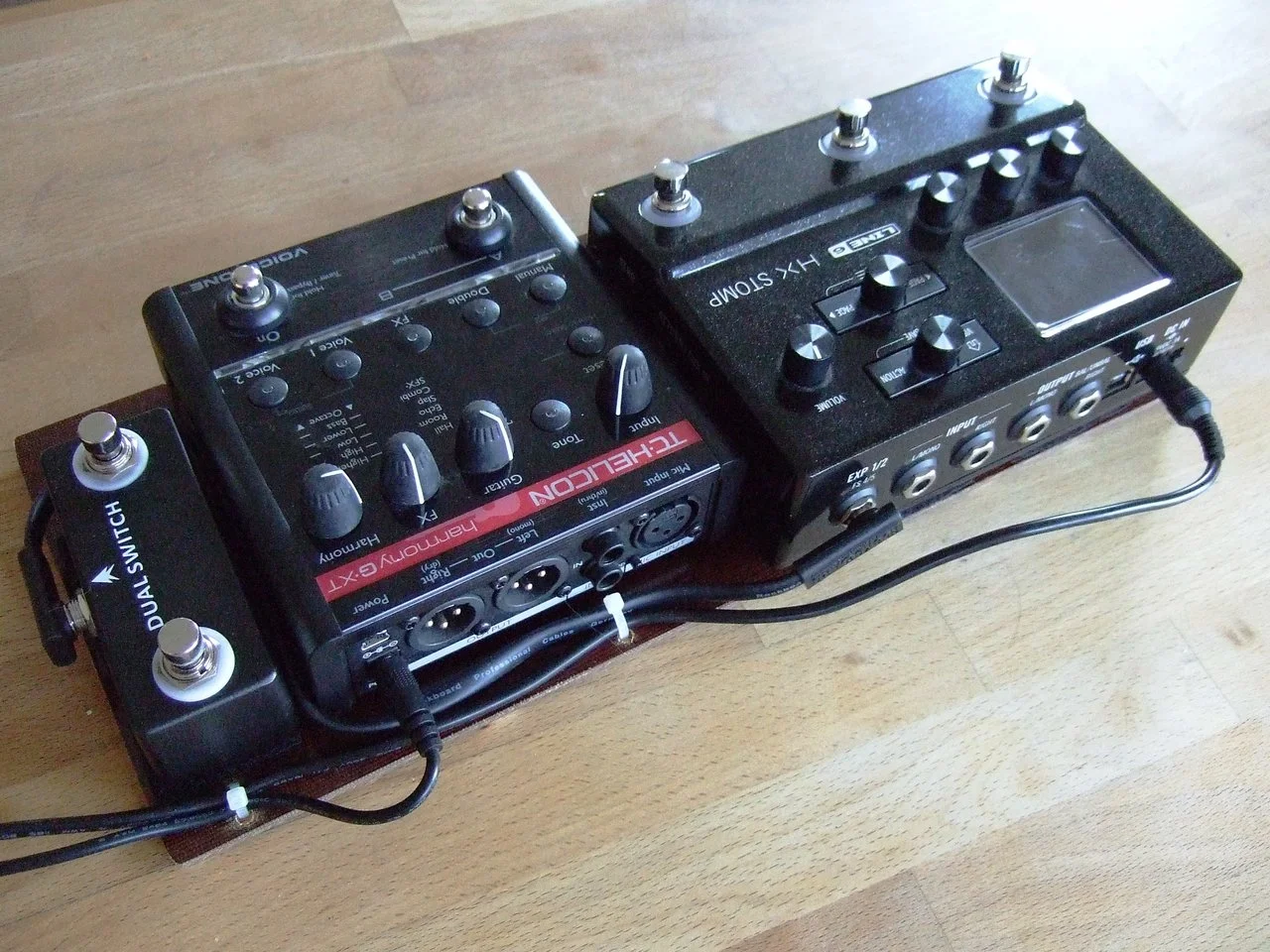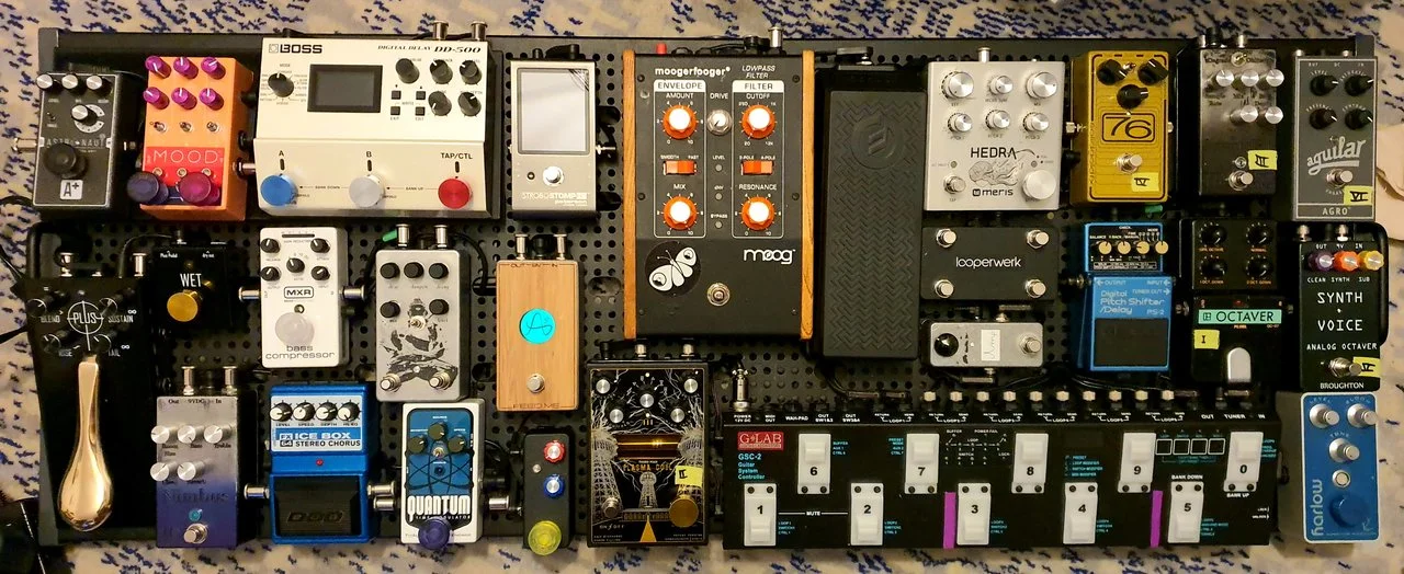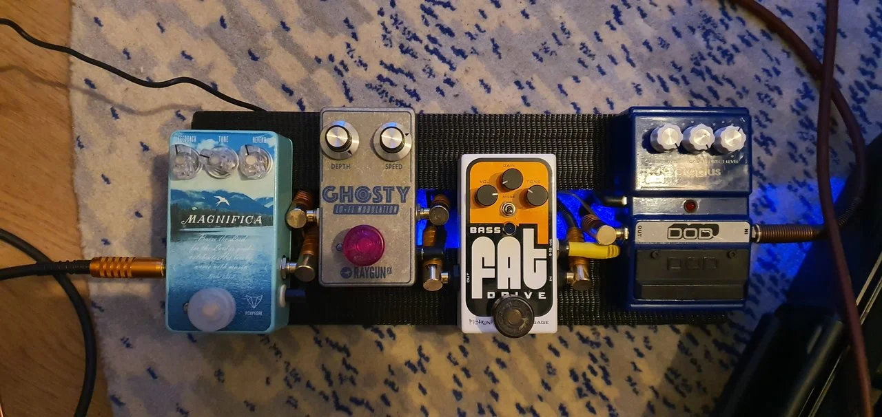auch nicht aufs board haben es verschiedene oktaver und andere Choruse geschafft, weil ich sie nicht brauche (kein einsatzfeld) und auch der T Rex Tonebug darf wieder gehen, weil er einfach zu "krass" ist für meine band. is eben kein high gain metal. unterschiedliche overdrives /drive treter sind nicht aufs board gekommen, weil sie zuviel ogrinal signal kappten(im wesentlichen tiefenfundament). der Big Muff war auch so ein ding, was gegen den totenschläger überhaupt nicht anstank und ebenso kein einsatzfeld besaß.