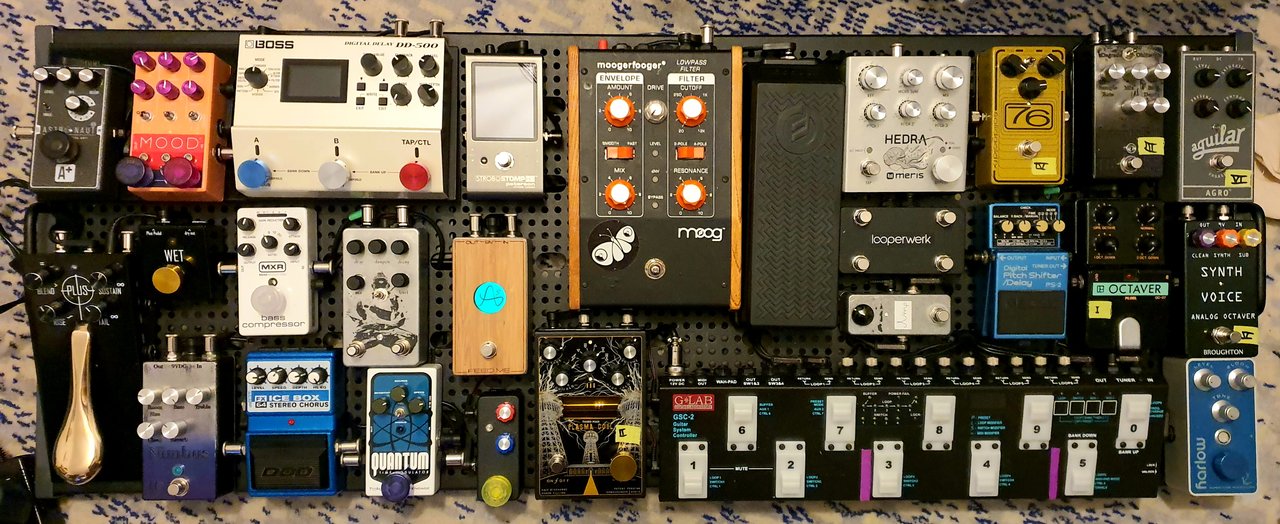 Boss TU 2 (ca 25 Jahre alt), Toadworks Switcher (weil kleiner als der SOMO). z z. hinzugekommen sind: TC Electronics Mojomojo, der definitiv bleiben wird, weil genialer old school sound für kleines geld und aus gleichem hause der spark booster (große variante) der sich etwas offener als der mojo verhält, aber im prinzip ähnlich aggiert. der könnte noch wieder rausfliegen, aber mal schauen. es kommen noch 1 oder 2 teile zu mir, dannach will ich schluss machen egal, wie diese tests verlaufen. irgendwann muss einfach mal stop sein.