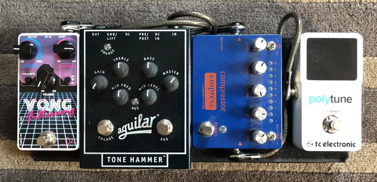 geblieben sind: T Rex Bass Juice, EHX Bass Clone mit vorgeschaltetem EHX Soul Food zum anblasen, er MXR M 80 , der Fame EQ (siehe Test) , mein