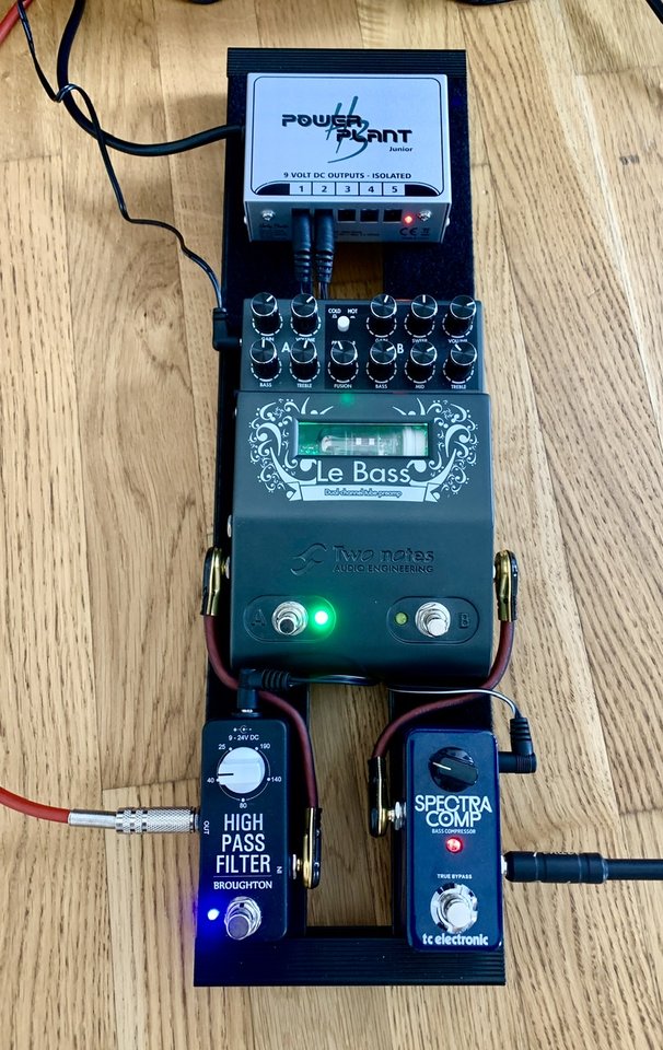 ToDo: neues Netzteil von HB/Thomann mit 12V unterboardig einbauen verschlankt Kabelwege und spart LeBass Netzteil. LeBass ist eignetlich immer auf Kanal A on, deshalb wenig Gefahr, auf die Potis der beiden Minis zu treten. Imho passt der HighPass auch besser nach dem PreAmp (hab beides ausprobiert). Trennfrequenz ist knapp unter 40 Hz bei 4 Saiter)