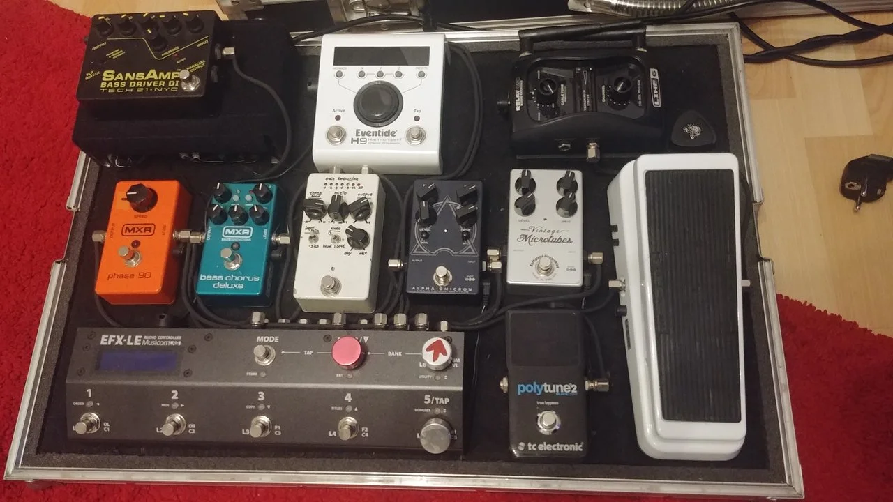 Der Musicom EFX LE Loopswitcher ist sowas wie der Gig-Rig Killer für paar Nullen weniger hinter dem Kaufpreis. Volle Midi Kontrolle, Loops verschieben, Tap Tempo an das H9 schicken, alles was du dir wünschen kannst. Tatsache ist aber auch, dass ich bei jeder einzelnen Show versehentlich daneben trete, weil der Mute Switch ausgerechnet in der Mitte zwischen Menü-Knöpfen sitzt und ich mich ständig in blinkenden Menüs wiederfinde in die ich nie wollte und mein Board zwischen den Songs per Strom aus/an neustarten muss. Einen Locking-Modus requeste ich seit einem Jahr bei Musicom als Update und werde nicht erhöhrt. Ich fange an das Teil zu hassen obwohl es so großartig ist.