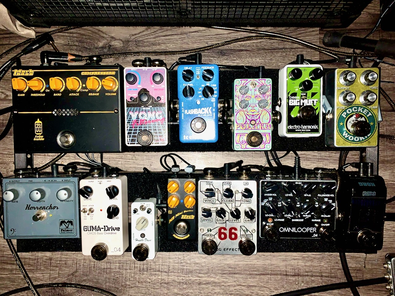Signalkette: Korg Pitchblack -> Omnilooper ( Pocket Wookie im Full-, Nano Bass Big Muff im Low- und Markbass Mini Distortion im High-Path) -> Cog Effects Knightfall 66 -> Mooer Hustle Drive (Fulltone OCD Clone) -> Guma-Drive -> Palmer Herrenchor (die überstehenden Bleche hinten weggeschnitten) -> Polara -> TC Flashback -> Vong -> Markbass Compressore