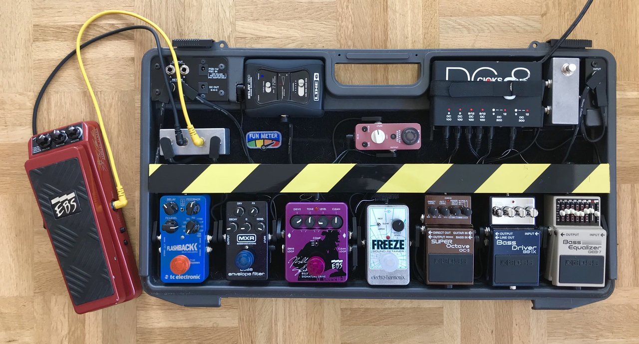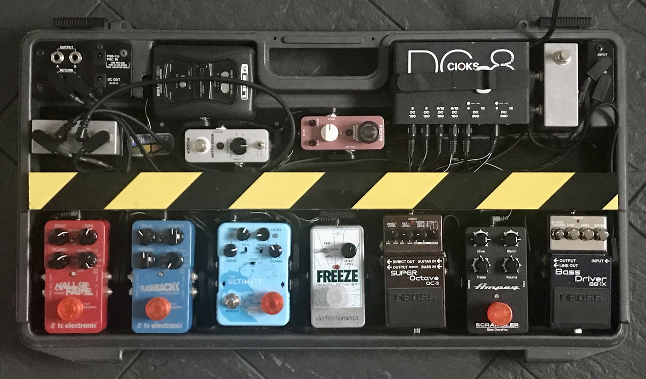 Habe eben bei der Beantwortung eines anderen Threats gemerkt, dass sich mein Board doch arg geändert hat... Also, hier mal wieder ein Update. Der EQ, der Envelope Filter und das GAS-Pedal durften gehen. Neu sind der Ampeg Scrambler, der Ultimate Billy Sheehan (im Tausch gegen den "Normalen") und der Hall of Fame. Der Mooer Tender (MK I !!) ist im Clean-Weg des Ultimate, der Mooer Noice Killer im OD-Weg. Ansonsten wie gehabt vom Empfänger in die A/B-Box, von dort ins Rack-Stimmgerät (gleichzeitig Mute-Funktion) oder in die Effekt-Kette.