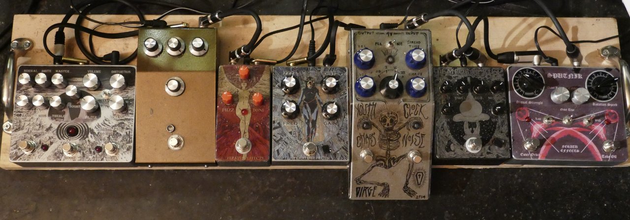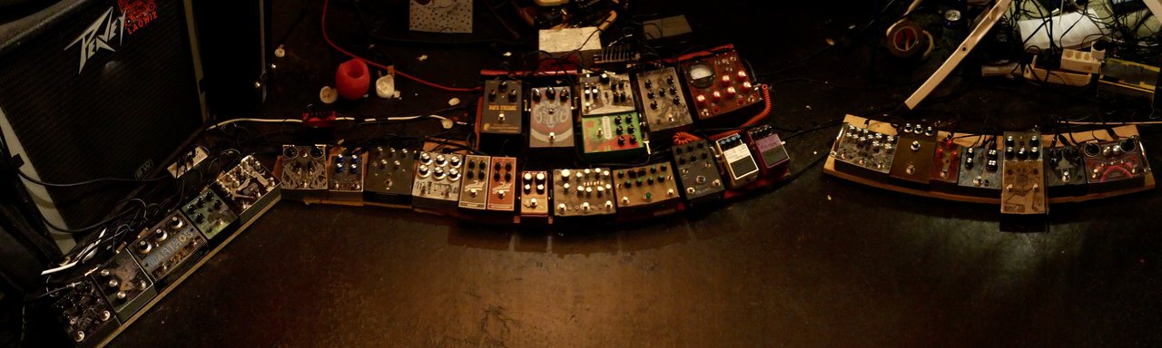 Hier links, eigentlich alles Zerren (Megalith, FZ-2, Life Pedal, Polaris, Muff, Bee Baa, Supa, etc.), vieles selbst gebaut: