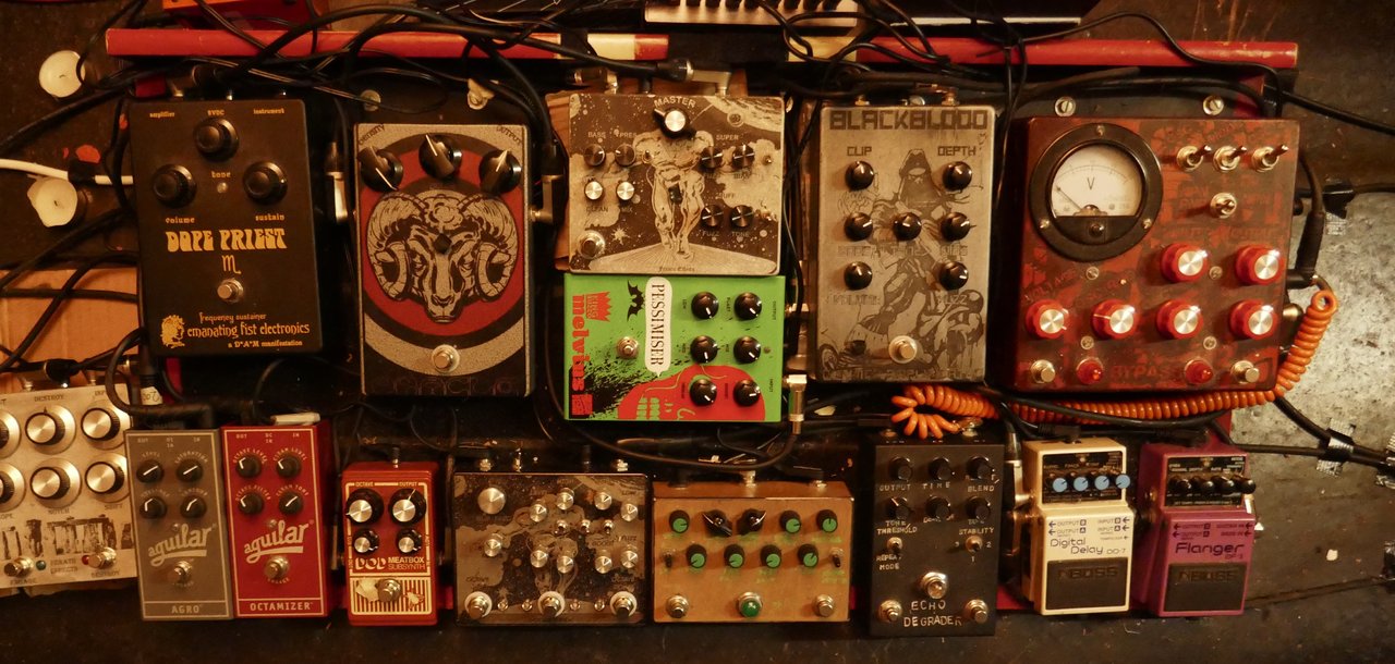 gutes Teil, mir gefällt allerdings bei den Videos das Synth-Video unten viel besser als die ganzen Gitarrendemos. Wäre echt mal gespannt das mal am Bass zu hören.Das rote ist ein alter Industrialectric Incinerator Deluxe, oscillating fuzz madness.